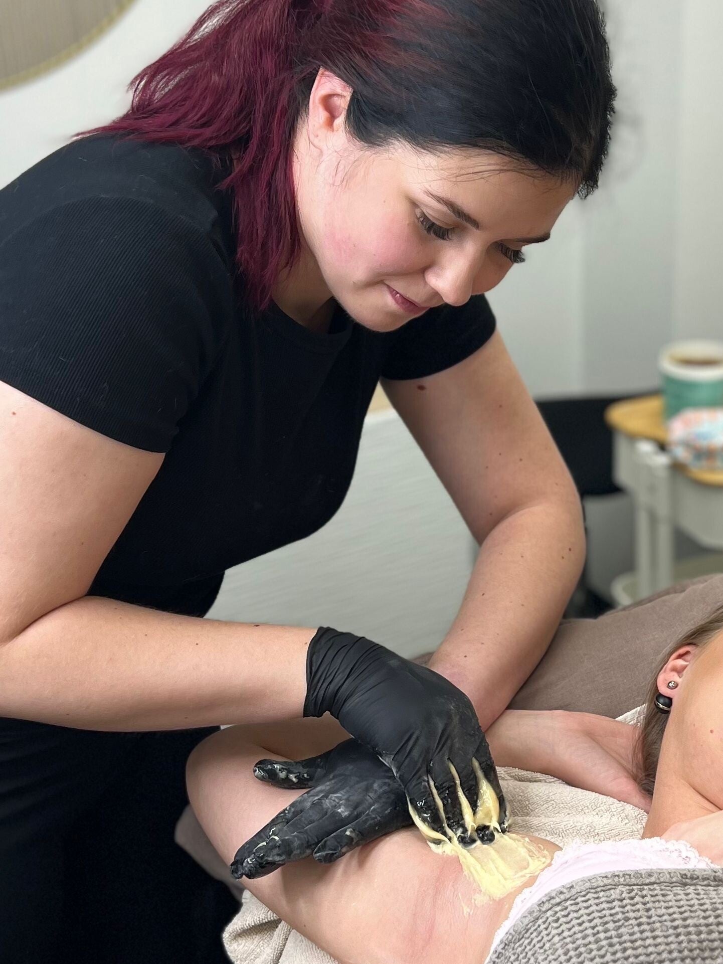 Temme karvanpoistoa vartalolta sokerimassalla, joka on hellävarainen karvanpoistomenetelmä